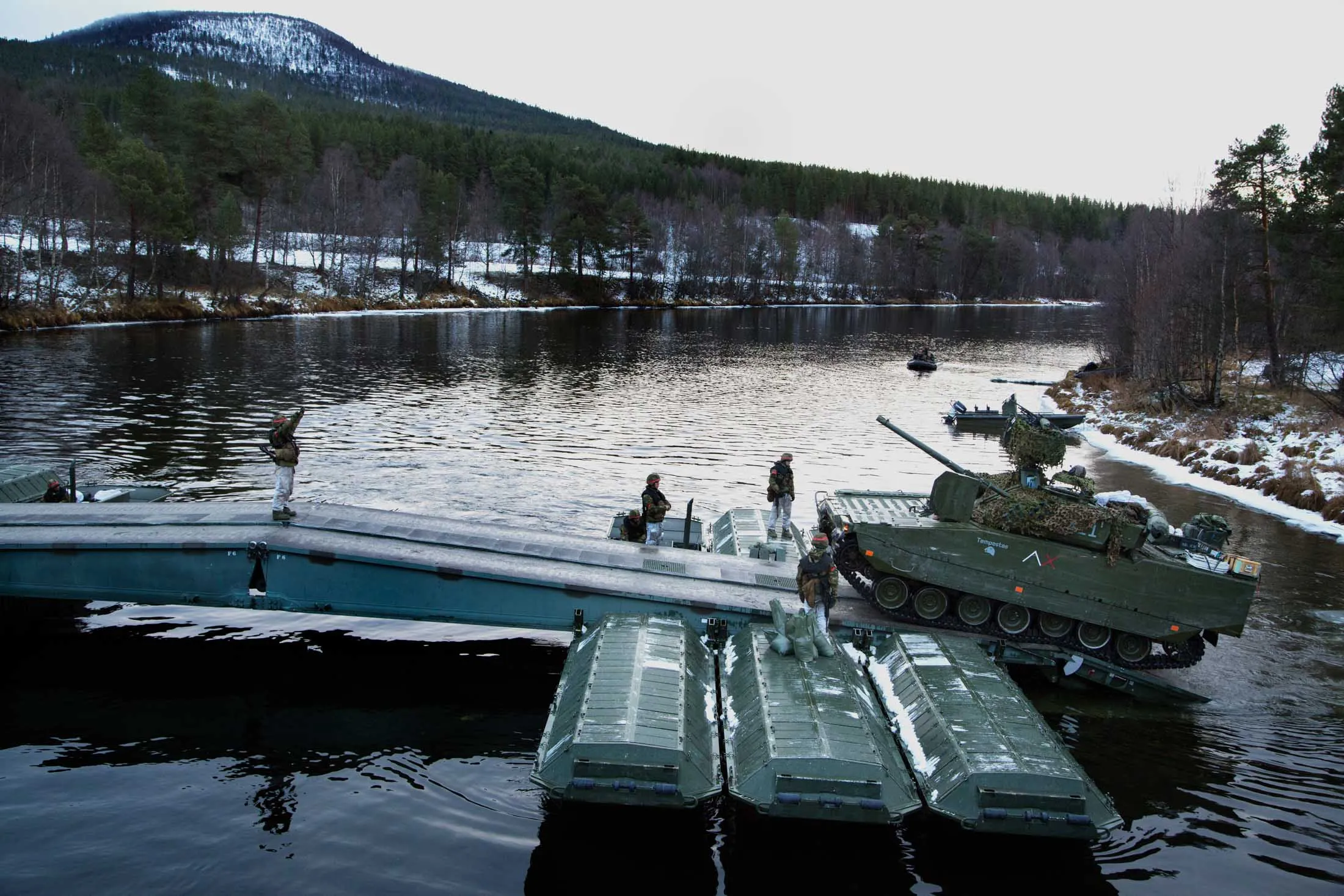 在挪威中部,战斗机和直升机在头顶轰鸣,战斗车辆在如画的峡湾旁驶过。来自欧洲和美国的数千名士兵在雪雨中跋涉,或挤进布满电子设备的装甲车中,这是一场严峻的排练,专家称未来的战争将是科幻与壕沟战的结合——假设没有使用核武器。