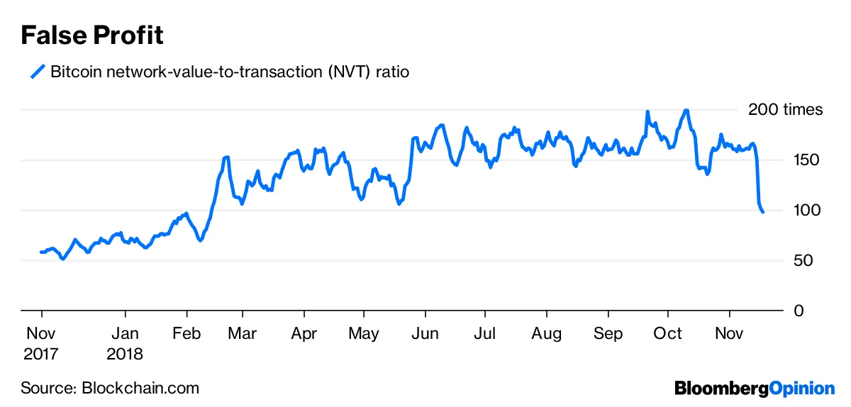 比特币在最近的股市崩盘中并没有成为安全避风港。事实上,在从峰值下跌近80%之后,它现在回到了去年杰米·戴蒙称其为欺诈时的水平。而且, 痛苦可能远未结束,斯蒂芬·甘德尔警告说。他引用了一种比特币特有的估值指标,称为“网络价值与交易”比率,这有点像加密货币的市盈率。根据这个指标,比特币仍然非常昂贵,尽管它已经下跌: