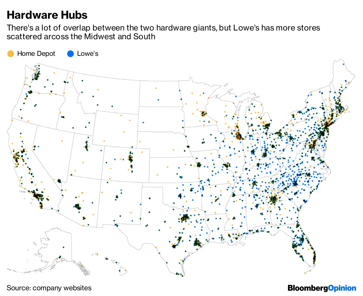 劳氏公司的国家看起来与家得宝公司的国家非常相似,注意到 莎拉·哈尔扎克 和 艾琳·何。但劳氏独自站立的地方说明了它为何 难以跟上 更大的竞争对手。