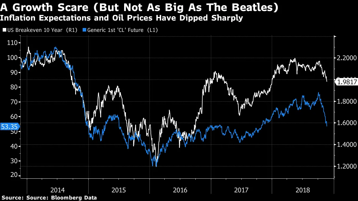 主要观点是,我们现在处于一个明显的增长恐慌中。在美国以外,投资者深感担忧,增长正在放缓。这对美国的影响之一是通过石油市场和通胀预期。债券市场的通胀预期因油价下跌而被压得远低于应有水平。今天油价的下跌不应该影响未来10年的通胀预期。但值得注意的是,10年期国债的盈亏平衡利率,即投资者对证券生命周期内通胀率的预期,周二首次跌破了美联储2%的通胀目标。