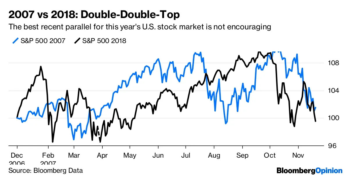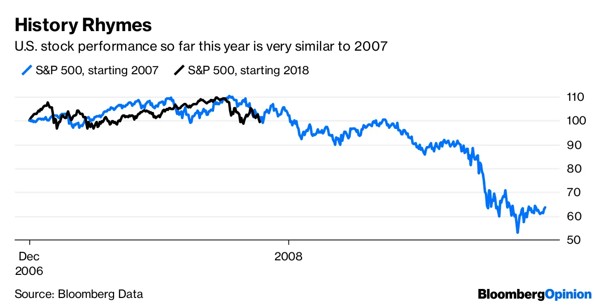话虽如此,我认为,正如我今年早些时候所说,2018年与2007年之间的相似之处看起来非常相似。这个图表显示了标准普尔500指数在2007年此时的表现(蓝色),并与今年的表现(黑色)进行了比较: