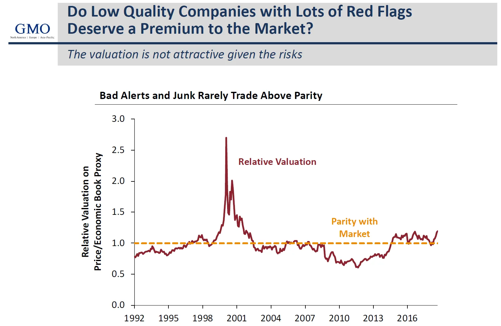 对于观察正在发生的事情,一种非常有趣的方式是,格兰瑟姆·梅约·范·奥特洛公司(Grantham Mayo Van Otterloo & Co.)的股票负责人尼尔·康斯特布尔(Neil Constable)保持了一份公司名单,这些公司因资产负债表不佳或盈利不稳定而被视为低质量,并且在公司治理方面存在红旗,例如经常延迟提交文件、未能保持分层董事会等。