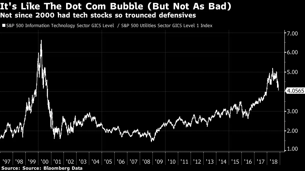 这表明市场在经历了一段过度之后正在放缓,但不太可能获得中央银行所期望的支持,这与2008年发生的情况相似。这个市场在某些方面也与互联网泡沫相呼应。那时和现在,关于一个具有巨大增长潜力的行业有很多兴奋,投资者不明智地对许多企业缺陷视而不见。但即使过去一年FAANG(Facebook、Apple、Amazon.com、Netflix、Google)现象与近二十年前的互联网泡沫有很多相似之处,但显然它并没有那么夸张。此图显示了标准普尔500科技行业与标准普尔500公用事业行业的比率: