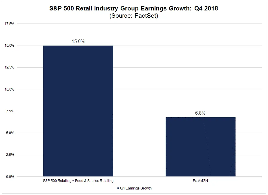 惊人的亚马逊。我们都知道亚马逊正在快速增长,并在此过程中取代其他传统零售商。但现在的预期水平如此之高,以至于亚马逊将很难超越它们——而零售行业的其他部分可能有不错的机会带来积极的惊喜。根据FactSet,预计亚马逊将在本季度占美国零售行业整体增长的超过一半。