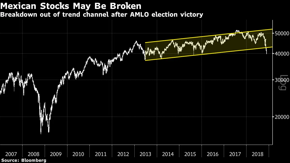 辛科建议,至少对于那些依赖技术分析的人来说,墨西哥股票可能已经“破裂”。《华尔街日报》发表了一篇极为负面的分析,称洛佩斯·奥夫拉多尔(被称为“AMLO”)正在吓跑外国投资者,而花旗集团则提供“AMLOVE”股票的篮子,以防他成为一位负责任的总统(这些股票包括银行和一些基础设施集团),还有一长串“AMSCARED”股票,即使他证明是干预主义者也可能存活下来,包括墨西哥一些最大的名字,如沃尔玛墨西哥、塞门斯、Femsa和卡洛斯·斯利姆的美国移动公司。由于已经疲软的银行业在周一遭遇了8.5%的抛售,AMLOVE股票表现糟糕。从美元的角度看,这使得墨西哥的基准股票指数跌至九年来的低点。