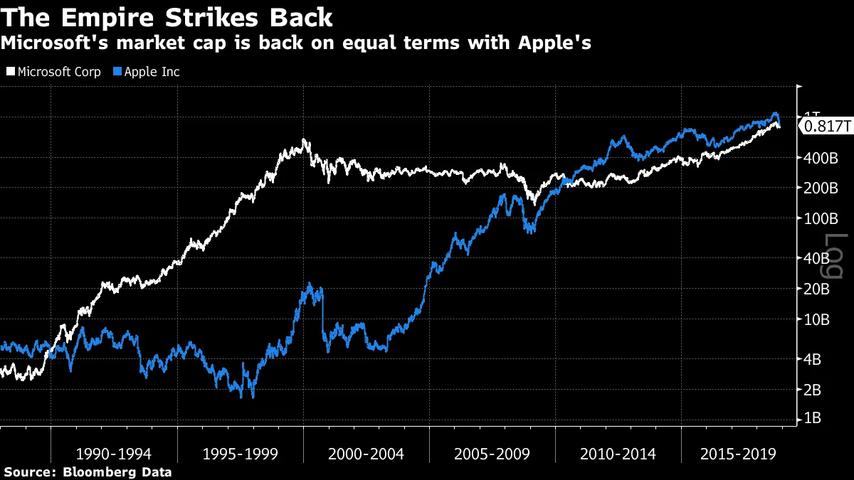 帝国反击战**:**这似乎几乎不可能,但苹果与微软之间的竞争再次升温。定义现代计算机的两家公司之间的斗争在1990年代似乎已经明确地倾向于微软,而在过去几年则倾向于苹果,但最近苹果股价的暴跌使得它们在市场价值上再次平起平坐。在周一的盘中交易中,微软在大约一个小时内重新成为全球最大的公司: