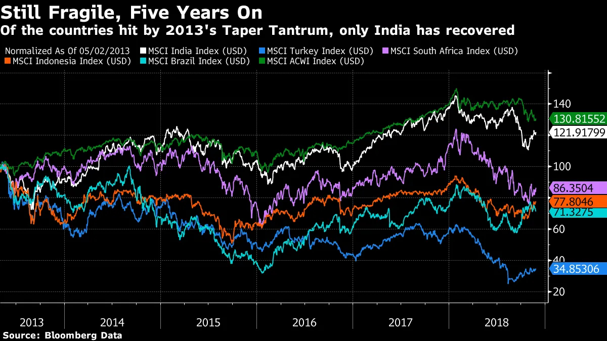 在“脆弱五国”中,印度是唯一一个在2013年缩减刺激政策风波中遭受重大经常账户赤字的主要新兴市场,其股市已经完全恢复,并且几乎与全球股市保持同步: