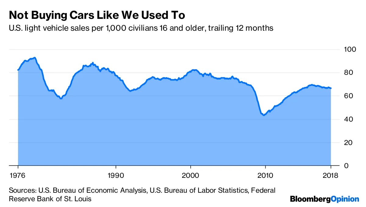 本周特朗普推特上的另一个攻击目标是通用汽车公司,尽管特朗普承诺要带回所有的工厂工作,但他们竟然关闭工厂并裁员,真是胆大包天,尤其是在一个摇摆州。但特朗普的愿望和意志力并不足以克服汽车行业的趋势,包括贾斯廷·福克斯提到的一个: 美国人根本没有开车那么多,而且他们无论经济如何都在更长时间内保留自己的汽车。这对通用汽车和竞争对手福特汽车公司造成了伤害,后者今天宣布了一项工厂调整。