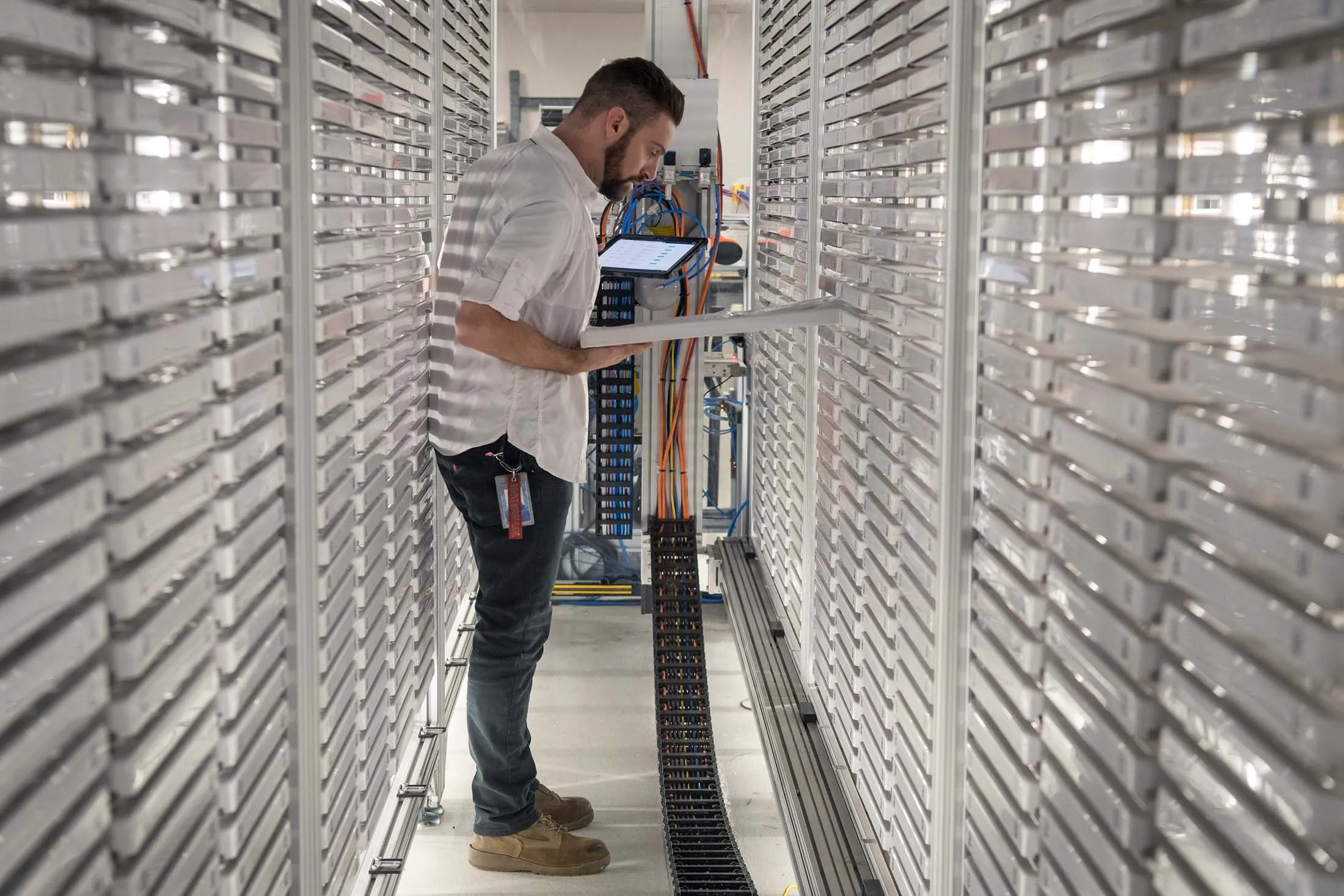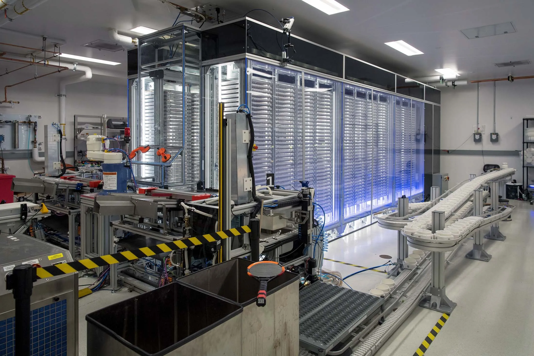 一台自动化幼虫饲养机器人在 Verily Life Sciences 位于南旧金山的实验室的蚊子工厂中。摄影师:David Paul Morris/Bloomberg至少如果加利福尼亚的实地测试顺利进行,这就是计划。每年蚊子季节——从四月到十一月——期间,印有“Debug Fresno”的面包车在满是多层住宅的绿树成荫的住宅区中巡游。在预定地点,算法会自动释放经过精确计算的蚊子数量,借助激光在蚊子离开面包车时计算每只蚊子。