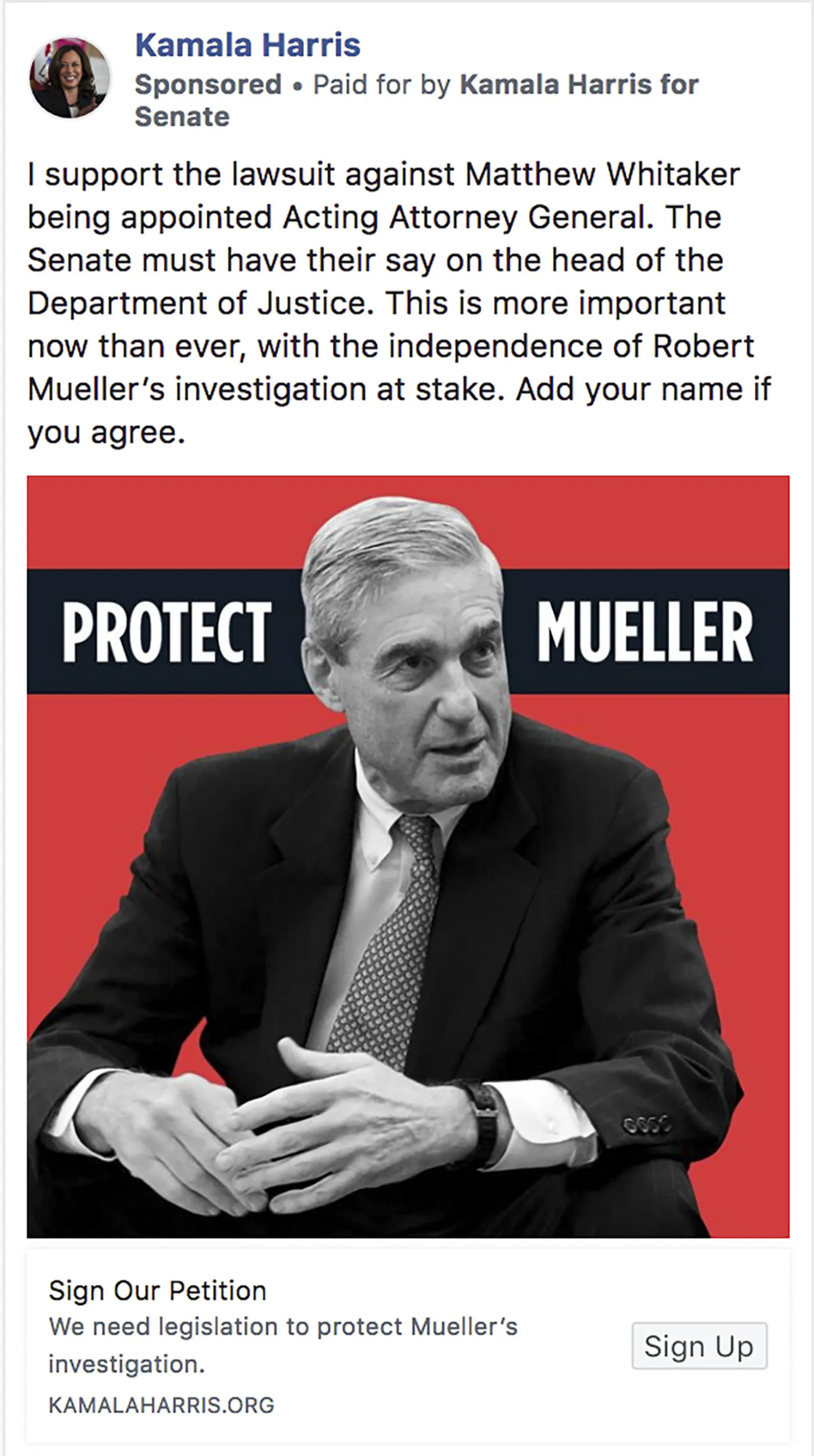 参议员卡马拉·哈里斯在Facebook上发布的广告,呼吁人们签署保护罗伯特·穆勒调查的请愿书。来源:Facebook林说,利用对穆勒的威胁进行炒作的紧迫感,反映了民主党战略家在2018年周期中学到的一课:候选人越早开始建立名单广告,他们从这项投资中看到的回报就越好。而利用党派新闻周期可以更快地提升这些回报。