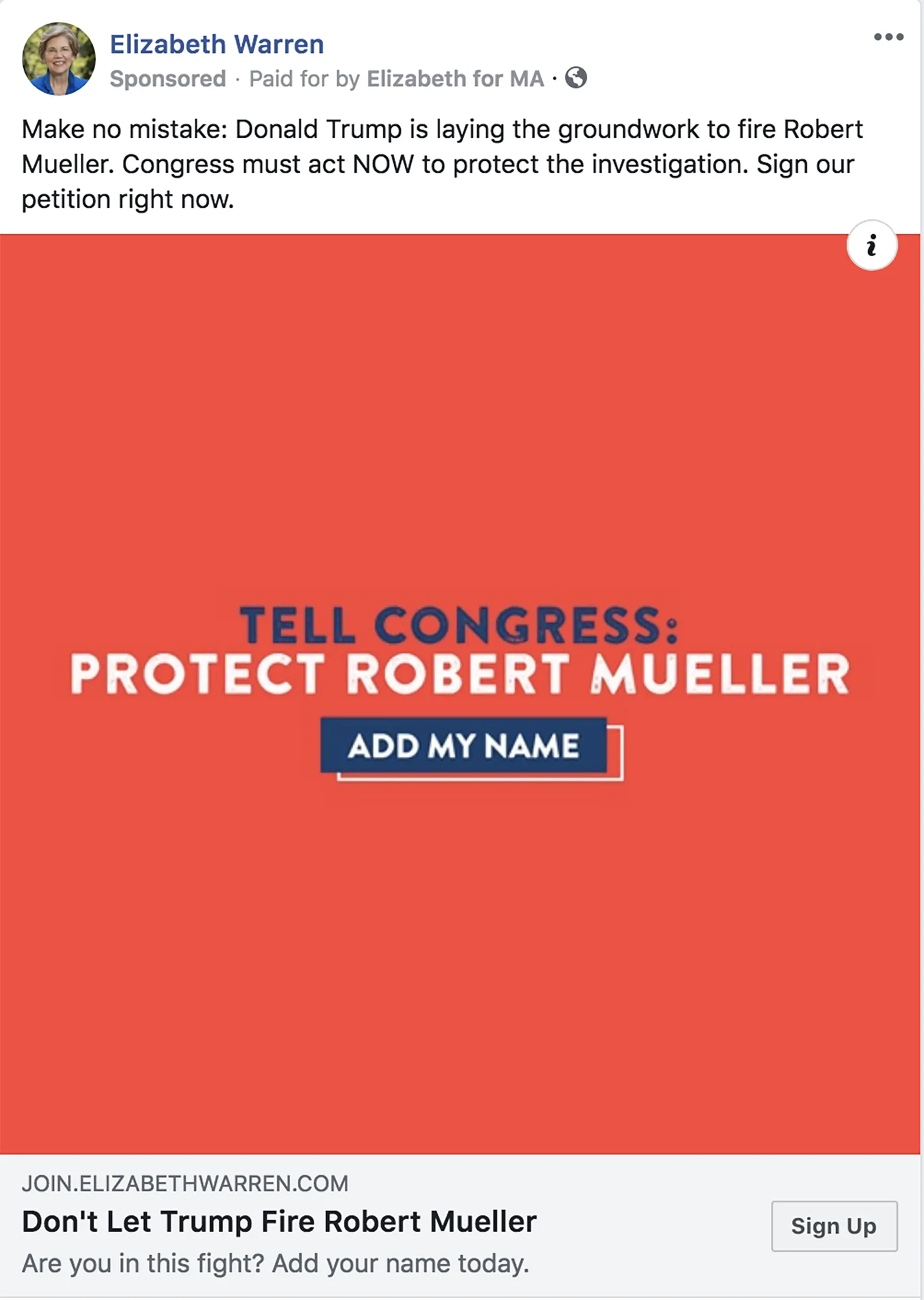 伊丽莎白·沃伦在Facebook上发布的赞助帖子,呼吁人们签署保护罗伯特·穆勒的请愿书。来源:Facebook“2020年总统竞选将是争夺人们的选票、支持、志愿者时间和资金的竞争,”非营利组织Acronym的传播总监瑞秋·托马斯说,该组织致力于选举进步候选人并研究数字广告趋势。“这是一种铺垫基础的方法,通过将人们带入你的社区,确保你与尽可能多的人建立直接联系。”