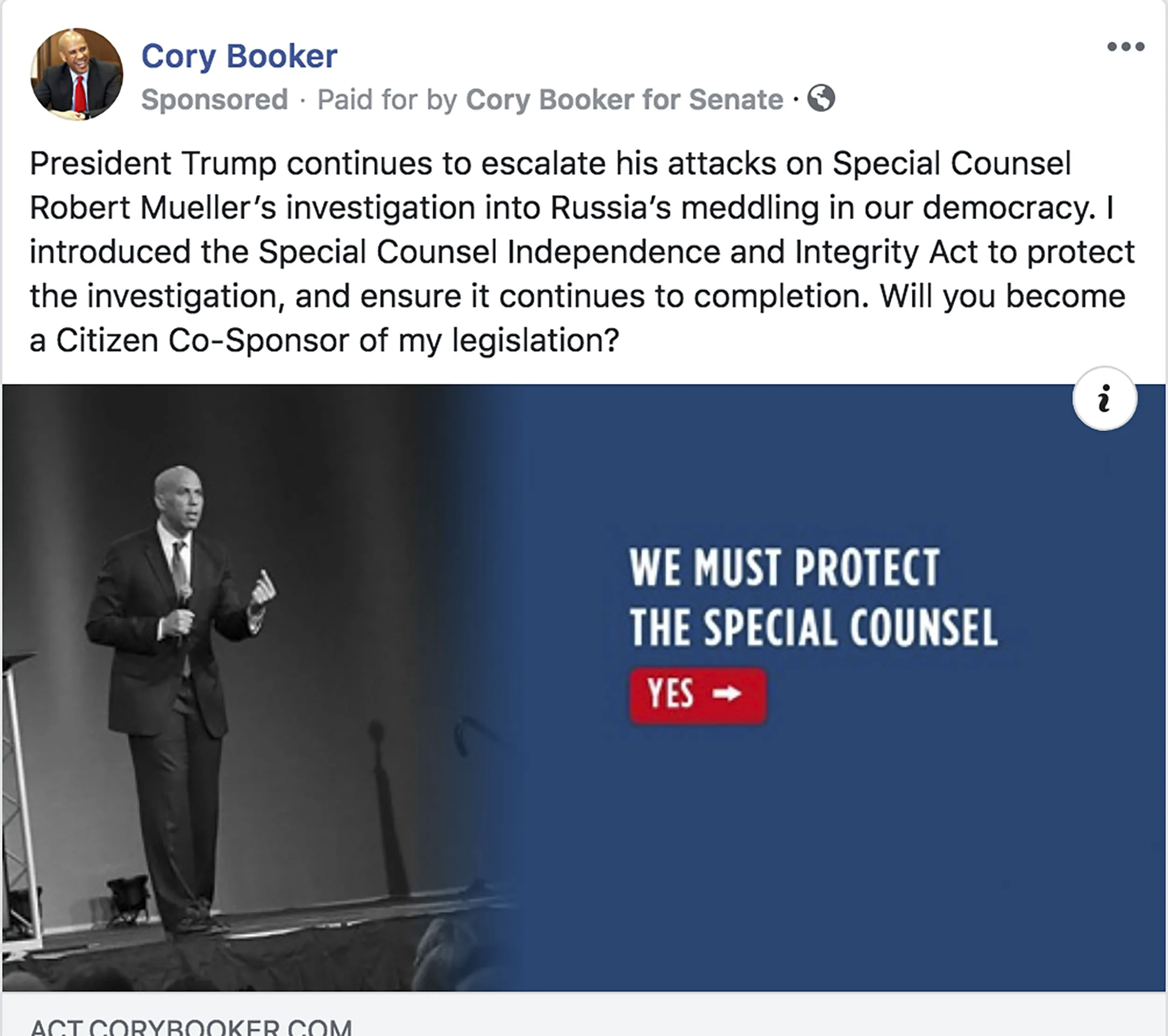 由科里·布克支付的广告,呼吁人们成为特别检察官独立与诚信法案的公民共同赞助人。来源:Facebook在秋季竞选期间,专注于医疗保健是有意义的,因为民主党候选人寻求独立选民和共和党人的支持,以及他们自己的选民。民调持续显示医疗保健是中期选民的首要问题。在利用这种广泛的吸引力在国会和州议会取得重大中期胜利后,2020年总统候选人现在正瞄准基层活动家,他们的支持在即将到来的总统初选中至关重要。