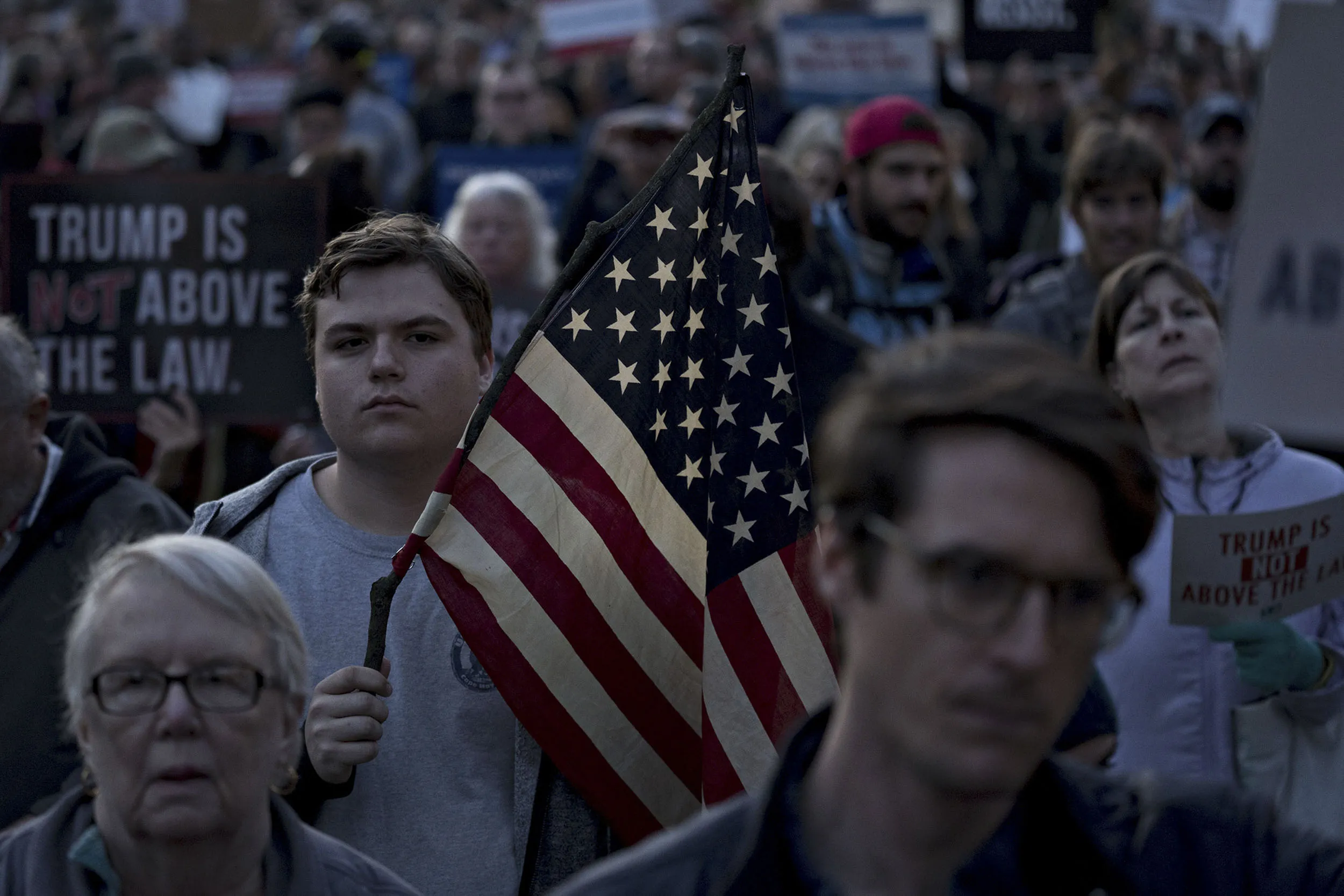 一名示威者在2018年11月8日于华盛顿特区白宫外,呼吁让代理总检察长马修·惠特克回避监督特别检察官罗伯特·穆勒,手持美国国旗。