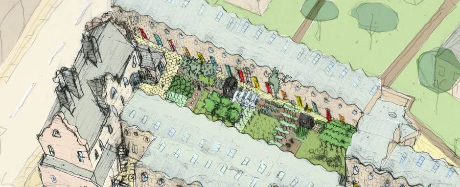 霍尔姆斯路工作室的建筑师图纸,为曾经无家可归的人们建造的围绕庭院的小屋,完成于2016年。该设计是对传统慈善房屋的改编。彼得·巴伯建筑师提供目前在伦敦吸引评论家的建筑师是 彼得·巴伯,他主要设计社会住房。巴伯以创新的方式重新混合传统类型,如中世纪的慈善房屋和维多利亚时期的背靠背住宅。他的建筑有城垛、鲜艳的前门和牛眼窗。巴伯是“现代主义者”,如果你将其定义为不认真模仿历史风格,但他的作品与诺曼·福斯特勋爵或汤姆·梅因的作品几乎没有相似之处,后者在斯克鲁顿最近的讲座中成为了攻击目标。现代建筑的范围远比斯克鲁顿所认为的要广泛得多。