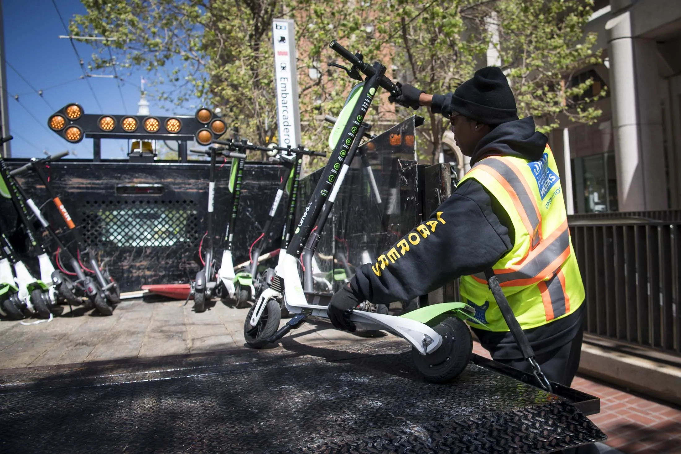 旧金山的一名城市员工将Lime的电动滑板车装载到卡车的后面。摄影师:大卫·保罗·莫里斯/彭博社更多的供应商意味着更低的价格,但制造多样化对Lime来说并没有完美奏效。11月,该公司不得不再次发出召回,因为一家名为Okai的中国公司制造的滑板车开始断裂。在一份声明中,Okai表示Lime关于其滑板车的说法是“武断和毫无根据的”。