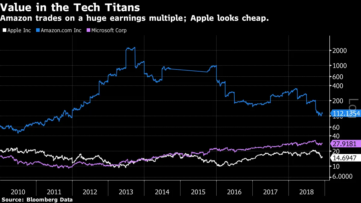 这是在对数尺度上,因为否则人们愿意为亚马逊的收益支付的巨大倍数将使得无法看到苹果或微软的任何差异。就市场而言,亚马逊仍然是一家未来增长潜力巨大的公司,投资者对这一增长的实现充满信心。苹果多年来看起来便宜,因为其收益增长如此显著,以至于投资者(甚至是看涨者)都谨慎地假设这种增长不可能持续。