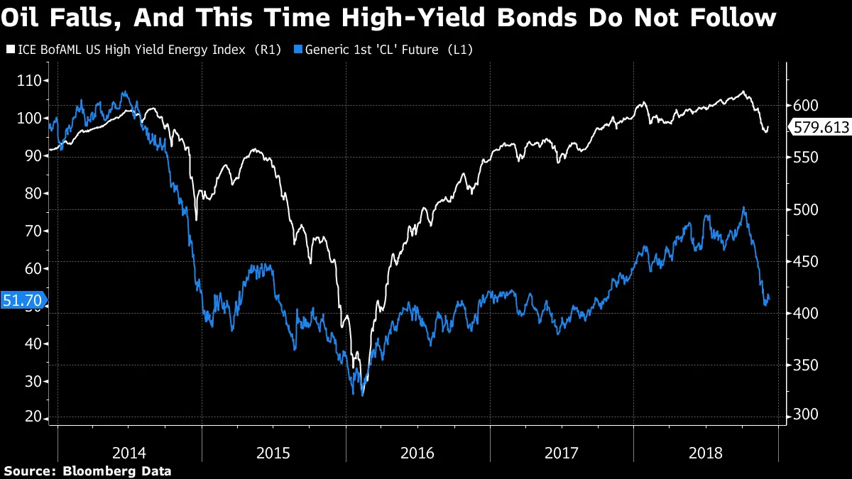 **一个不吠叫的能量狗:**在世界其他地方的兴奋中几乎被忽视,OPEC未能宣布石油供应协议,油价再次暴跌。油价下跌降低了通胀预期,并推动了我们现在在固定收益资产和股票中看到的大部分活动。但在美国,交易员们认为,上一次石油抛售的最危险的下行风险已经消除。在2014年和2015年,能源公司的高收益债券危险地下跌。这一次,反应却很温和。人们相信,许多利用页岩气繁荣的借款人现在的财务状况良好。希望这是正确的: