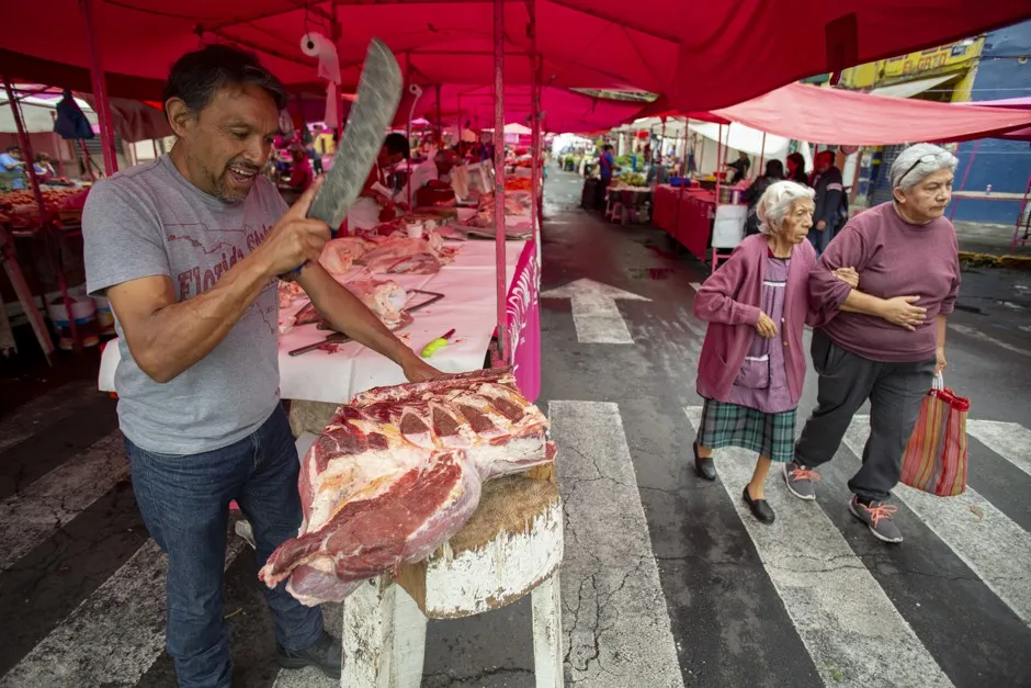 雷蒙多·希门尼斯在他的肉摊上忙碌。古斯塔沃·格拉夫雷蒙多·希门尼斯,61岁,在市场上做肉贩已经35年了。“在这之前我是一名工人,我更喜欢这个。你在外面,可以接触到人们,大家开玩笑很多,”希门尼斯说。他补充说,摊位以前的销量要高得多——现在每天只卖半头牛的尸体,而十年前是卖一头半。他们以前是为整周购买,但现在只买几天的量。他目前每天的收入在200到300比索之间。
