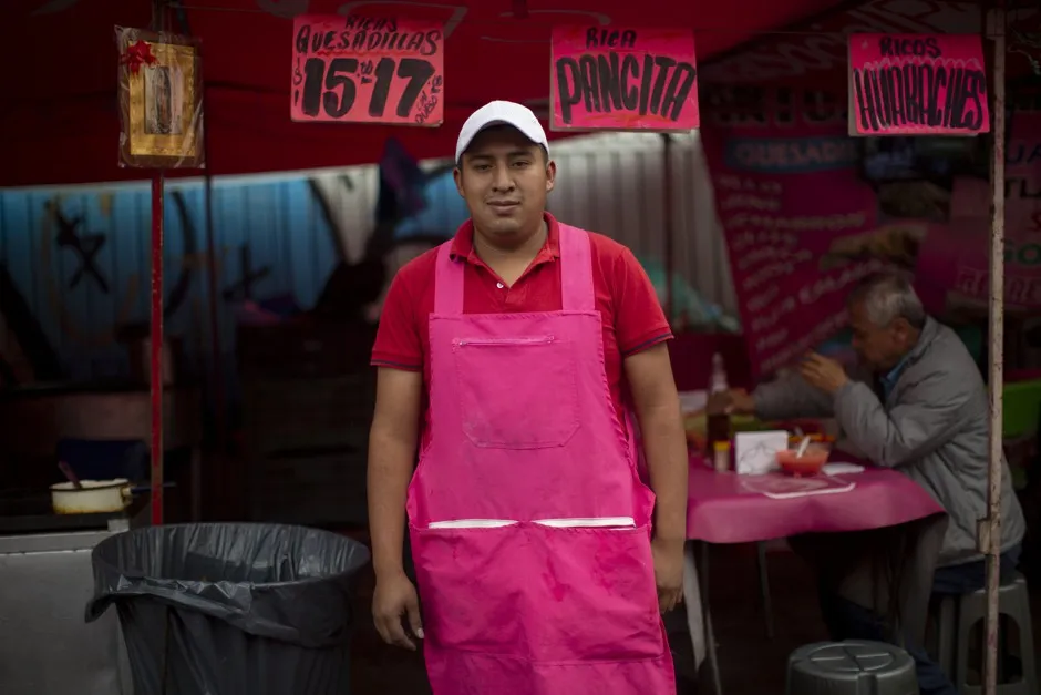 胡安·巴尔加斯在Mercado Sobre Ruedas经营一个玉米饼、肚子汤和奶酪饼摊位。古斯塔沃·格拉夫胡安·巴尔加斯,21岁,是一个奶酪饼摊位的老板。他说,一个摊位通常每天可以赚取1,500到2,000比索的利润。摊位不能出售,但据他说,非正式的价值在100,000到200,000比索之间。通常摊位的货源来自墨西哥城的中央批发市场,常被称为世界上最大的市场。“我们在质量和价格上与超市直接竞争,”巴尔加斯说,并补充道街市的竞争优势在于产品的新鲜和友好。