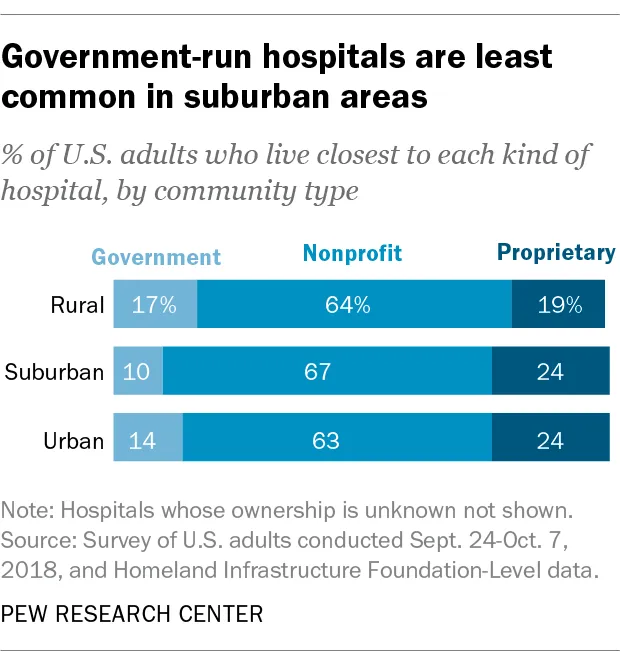 根据GAO报告,营利性医院关闭的可能性也过高,占所有农村医院的11%,但占农村关闭医院的36%。皮尤的研究得出了类似的结果,发现农村成年人生活在营利性医院附近的可能性较低(19%),而郊区或城市成年人则为24%。农村成年人生活在政府运营医院附近的可能性几乎是郊区成年人的两倍(17%),而郊区成年人为10%。