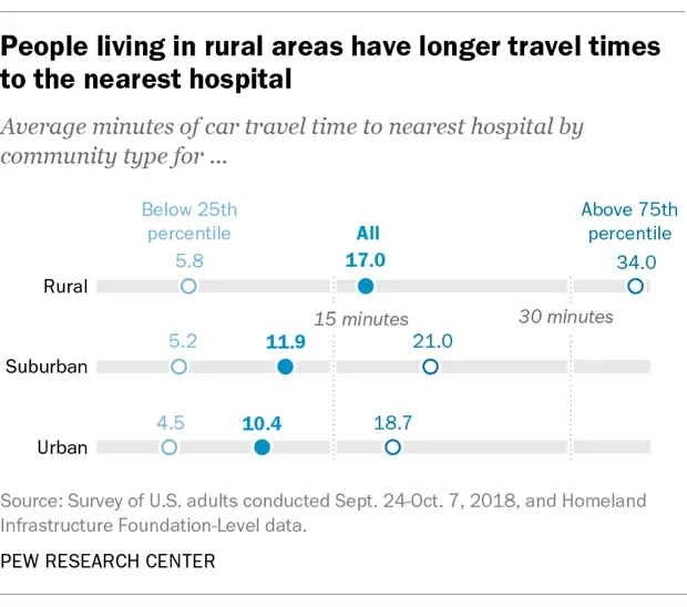这是第一项将医院旅行时间进行映射的皮尤研究,报告的计算社会科学家亚当·休斯表示,因此他们无法对时间进行任何明确的比较。但是,研究指出,最近由于主要在农村地区的医院关闭,情况可能变得更糟。根据一份美国政府问责办公室报告,2013年至2017年间,64家农村医院关闭。这是前五年关闭数量的两倍多,且超过了同一时期新开设的农村医院数量。