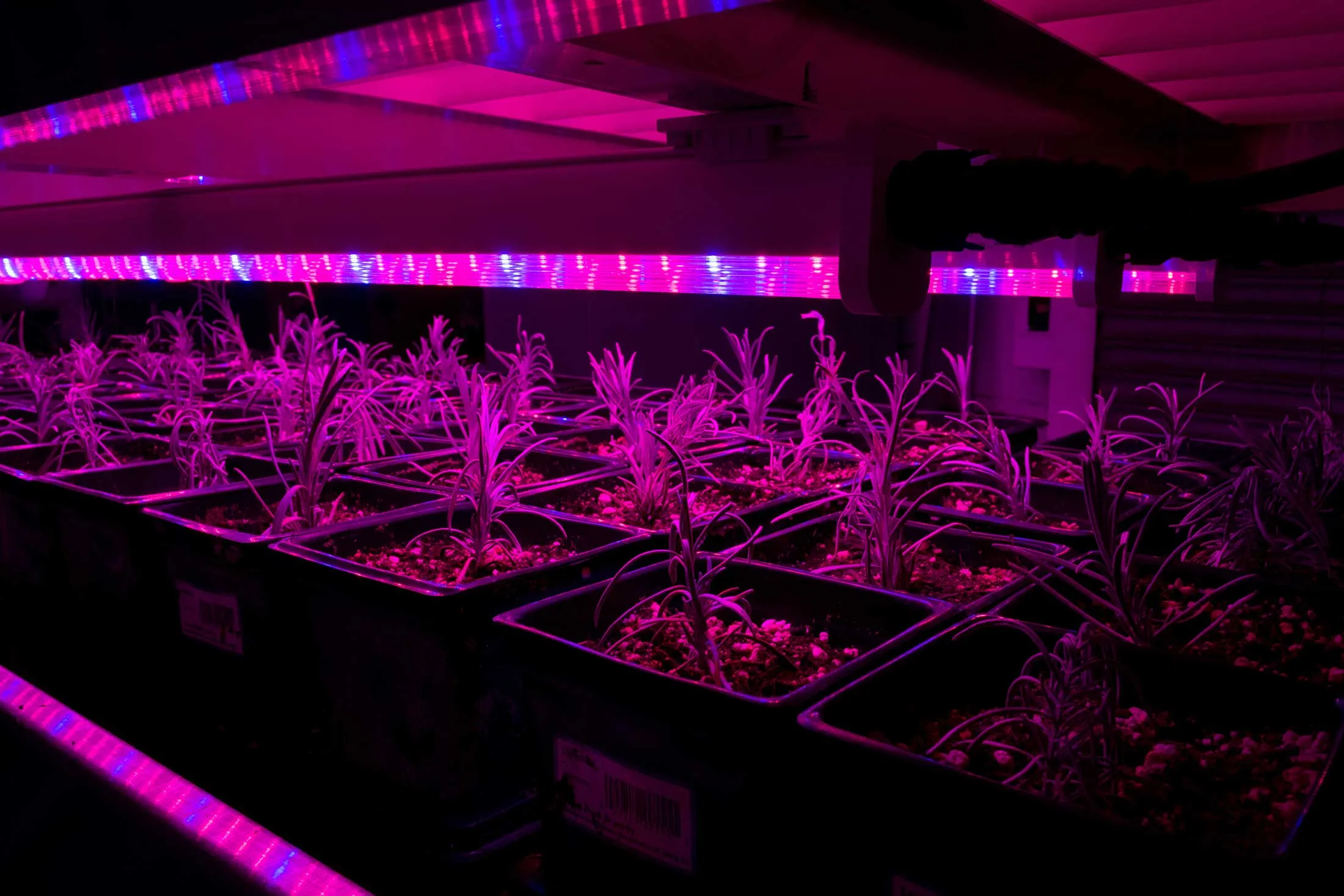 未来场地的薰衣草是从成熟植物的插条中生长出来的,并在24个人工照明的繁殖架上孵化。这些架子一次可以在4英寸的花盆中生长3,000株幼苗,但明年春天,团队将改用2英寸的花盆,将容量增加到30,000株可以在8到12周内移植到户外的幼苗。摄影师:罗杰·梅为《彭博商业周刊》拍摄