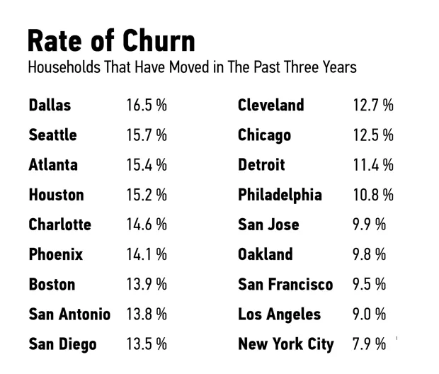 我们不必仅仅通过间接指标来猜测流动率。 美国社区调查 定期询问家庭是否在过去一年内搬入单位,并报告这些回应的三年平均值。事实证明,美国主要城市之间的流动率差异很大。纽约确实拥有最低的流动率:大苹果的住房周转速度几乎是达拉斯或亚特兰大的两倍。