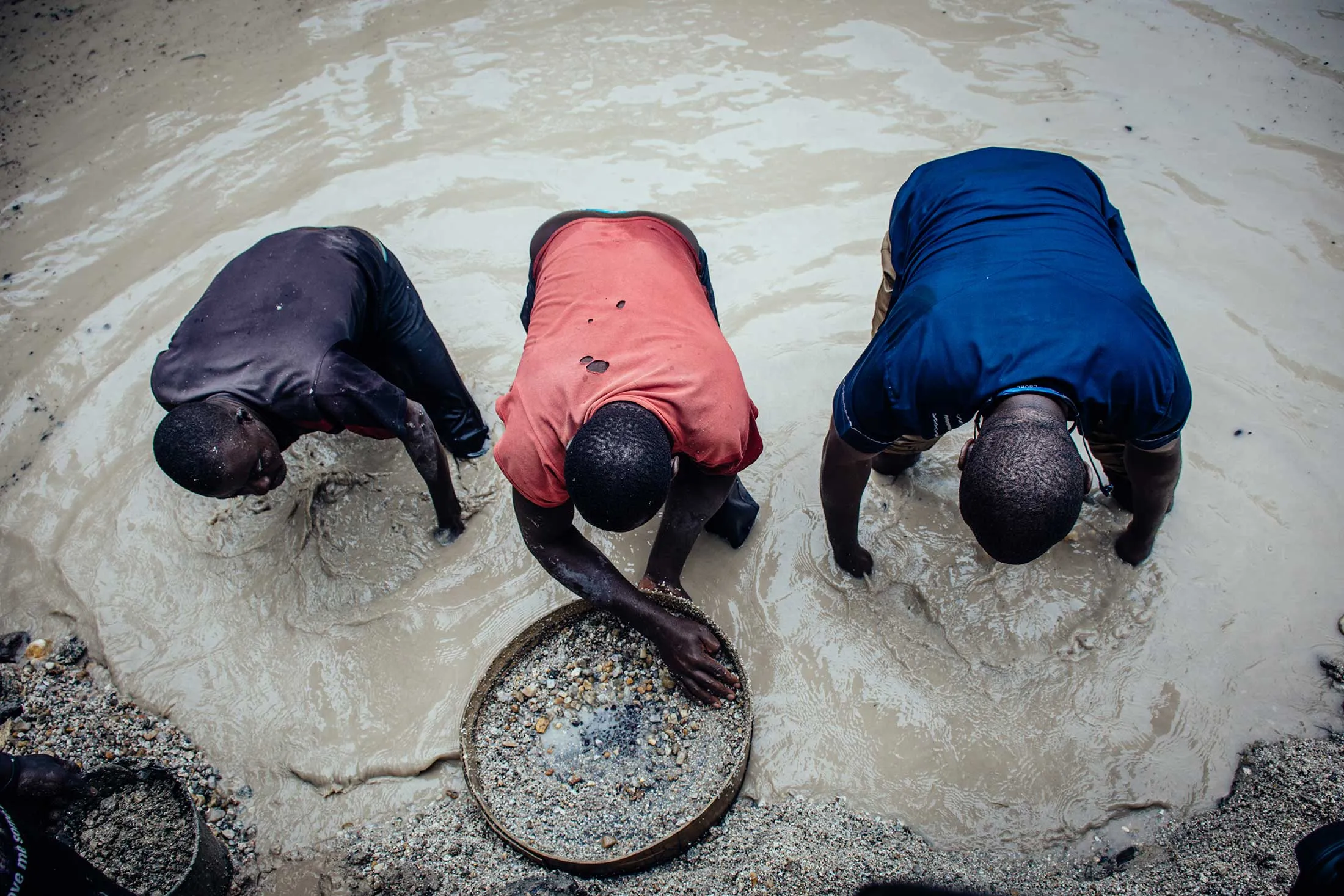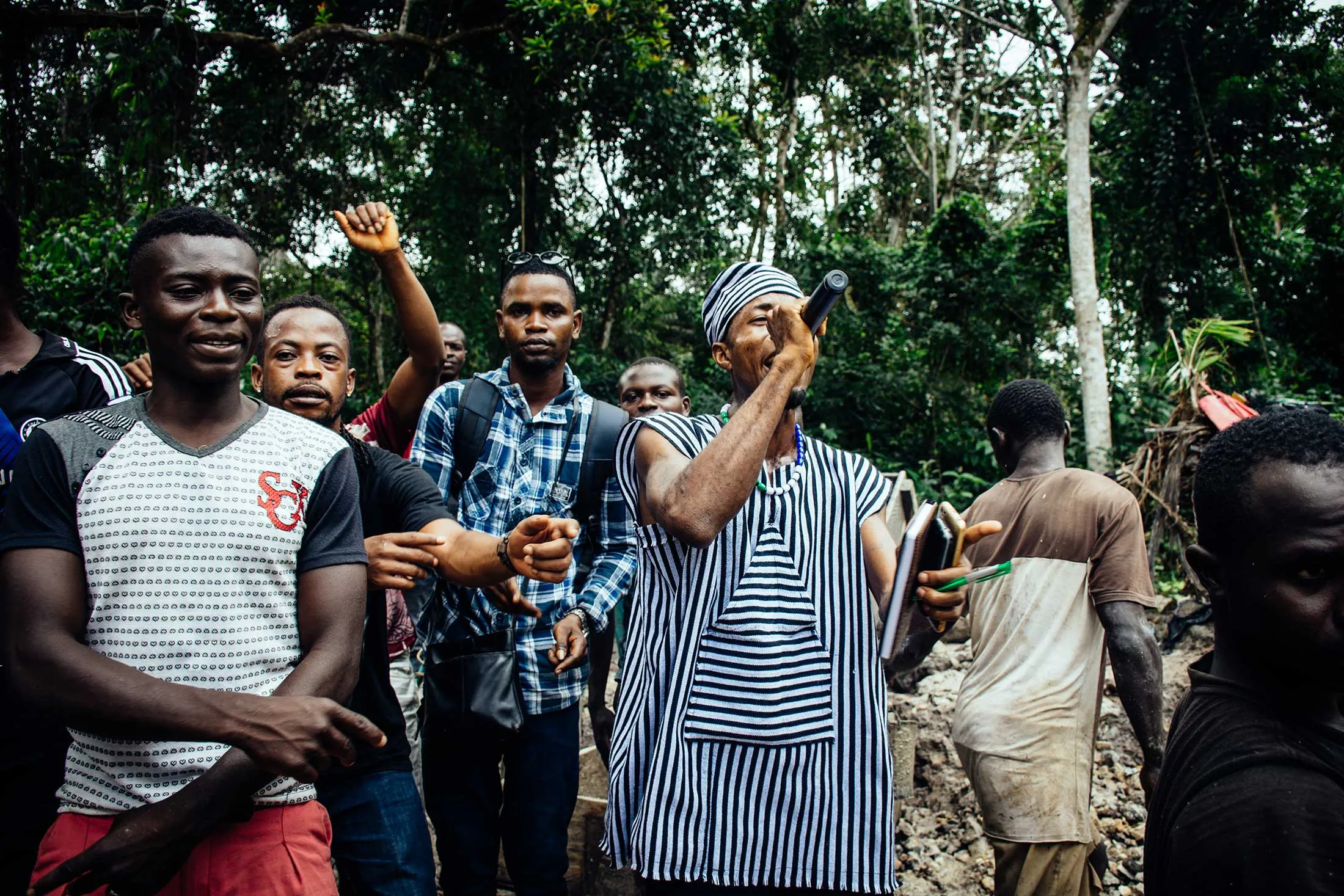 几个挖掘者站在一个矿坑里,踩在浑浊的棕色水中,用淘金盘筛选沙砾。陪伴莫莫和拉帕波特的一个村民拿着摄像机,另一个则抬着一个大音响,放在矿坑的沙质边缘。音乐开始响起,五个男人开始在一个紧密的圈子里跳舞,在镜头前摆出姿势和手势。