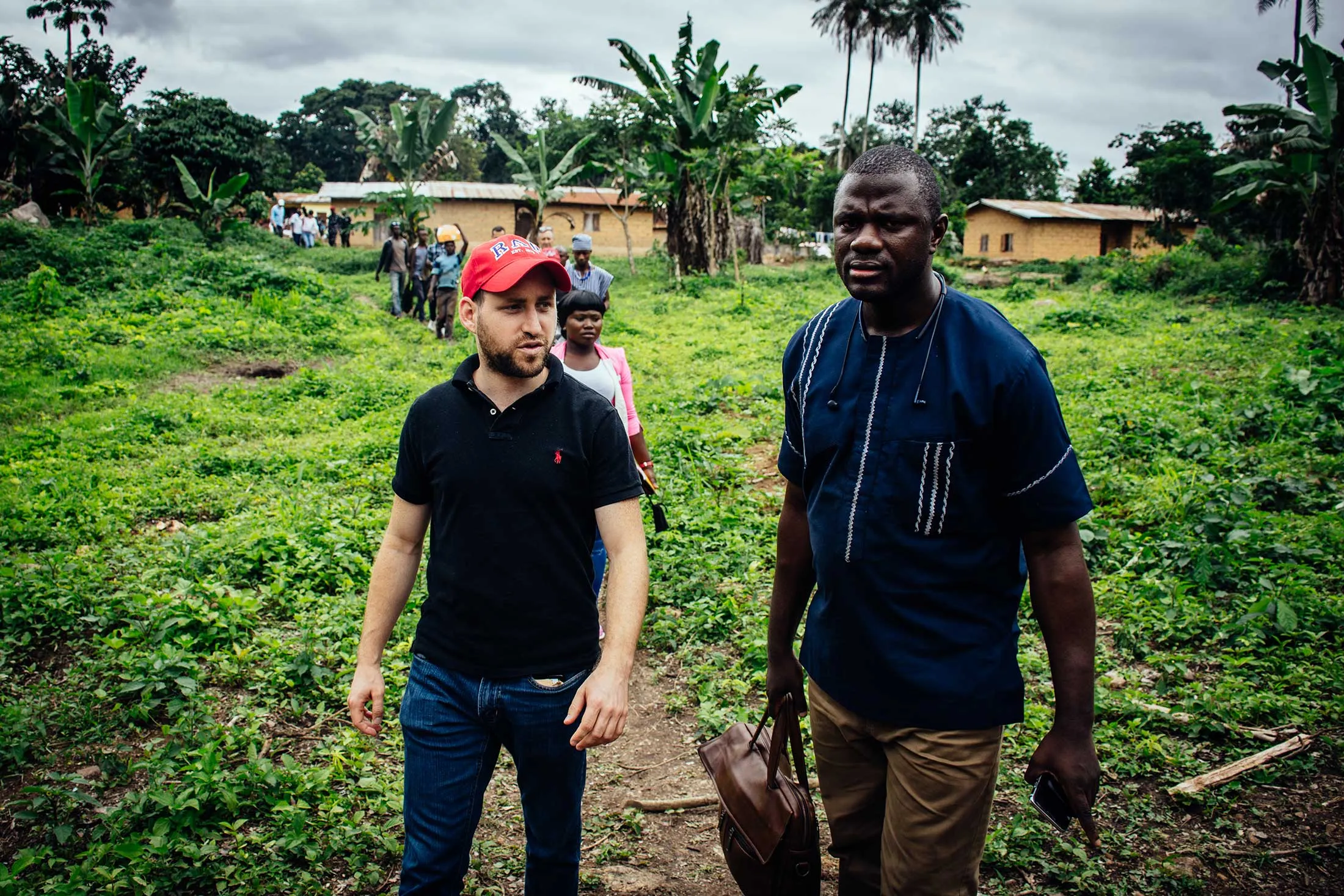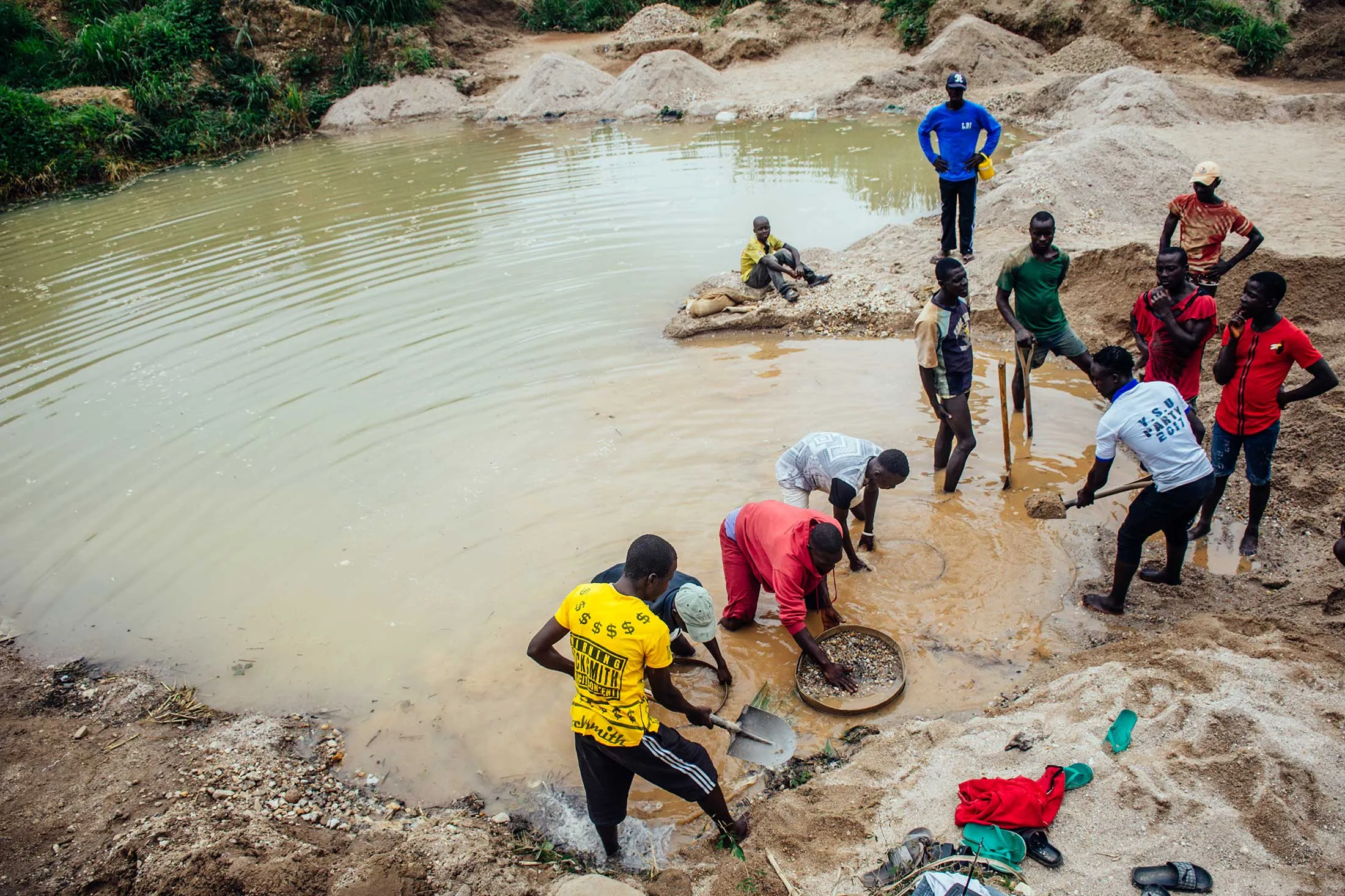 矿坑的参观结束后,Momoh带着大家回到村庄,途经一片倒下的树干躺在泥土中的空地。几名穿着安全帽和反光施工背心的工人在附近闲逛,其中一人穿着一件背心下的T恤,上面写着:“耶稣来了——看起来忙碌。”这些人是与政府签约的中国公司的员工,负责为Koryardu提供承诺的基础设施改善。Momoh注意到工人们已经在这个区域清理了几个月,但仍然没有完成。在工人脚边的泥土里,有一个空的黑色指挥官金酒的铝箔袋。