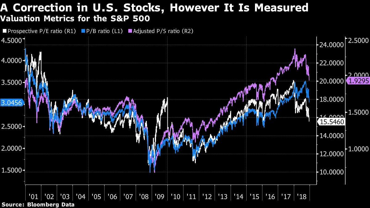量化宽松的岁月确实是危险的,正如特朗普七年前所指出的。但它们可能造成损害的时刻直到现在才到来,因为美联储试图撤回。而考虑到美联储撤回的强烈理由,以及他们所发出的所有警告,表明他们将这样做,现在暂停将显得非常可怕。引用布利茨的话:“如果FOMC跳过12月,他们实际上是在告诉市场,‘我们很担心,’这从来不是中央银行理想的沟通方式——尤其是在就业和工资增长仍然非常积极的时候。”有一点特别重要。许多人注意到,正如彭博新闻的卢王所报道的,当股价如此疲软时,美联储加息是极其罕见的。但我怀疑,这在很大程度上是因为当经济陷入困境时,股价往往会受到打击,而美联储在经济陷入困境时往往不会加息。如果股价因之前的高估水平而下跌,那么美联储没有特别的理由去关心。截至今年年初,基于预计收益、销售和账面价值的一系列最简单的指标都表明,股票被严重高估,并不特别便宜。我并不是建议任何人放松警惕,但这张图表表明,今年的行动正是健康修正的定义。虽然可能感觉不是这样,但事实就是如此。而美联储相当喜欢健康的修正。因此,股市投资者看到他们的投资组合经历了艰难的一年,并认为这足以让美联储放松政策,应该理清他们的想法: