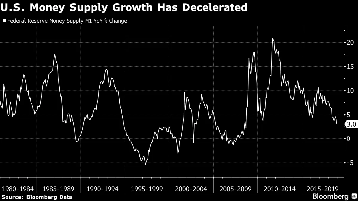 **长期反向水獺:**考虑另一种情况,假设——尽管兴奋的水獺对美联储发出警报——我们将避免在本周发生巨大的“反向水獺”。明年发生更长时间的“反向水獺”的机会有多大?这里的相似之处在于1998年和长期资本管理公司的灾难。那些对这场为十年后金融危机进行的彩排不太了解的人应该阅读 《天才的失败》,这是罗杰·洛温斯坦的一部经典金融新闻作品。一家庞大且过度杠杆的对冲基金在俄罗斯违约危机突然使其面临巨额损失时陷入困境。美联储以著名且有争议的方式将投资银行的头撞在一起,以组织救助。接下来发生的事情是最重要的。资本市场的流动性继续枯竭,最终在阿兰·格林斯潘的领导下,美联储在一个星期四的下午毫无预警地降息,当时市场正在交易。银行股几乎瞬间上涨了10%,TheGlobe.com的首次公开募股——其股价在首日上涨了十倍——几周后随之而来,故事突然完全不同。通过让步,美联储成功地让市场自我调整,避免了立即的经济崩溃。但他们也最终延长了市场周期和商业周期。资金涌入科技股,特别是互联网公司。曾经是牛市顶峰的市场突然转变为一个史诗般的泡沫,随后是史诗般的破裂。股市之外的金融条件收紧表明这可能会发生。《金融时报》本周末指出本月迄今为止,没有任何公司成功进入美国高收益债券市场。这让人非常想起LTCM危机后的恐慌,令人非常担忧。这就是货币供应增长的情况,如M1所示: