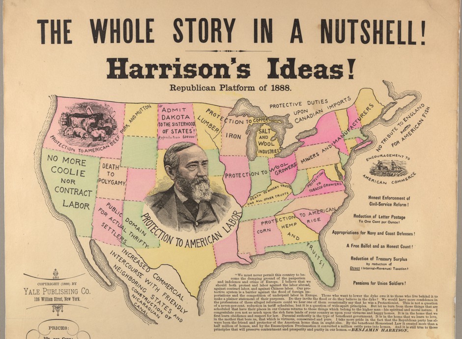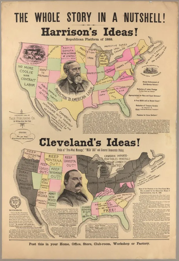 这张名为“简而言之的整个故事!”的地图,显示了一个下垂的克利夫兰在一个苗条的哈里森下面,哈里森被置于柔和的粉彩州之间,而围绕克利夫兰的几个州则是令人不安的灰色。地图宣称哈里森(最终的胜利者)将“保护美国劳动”和木材、铁、米、玉米、大麻和水果等产品,而克利夫兰将摧毁羊毛种植者、矿工等。在克利夫兰附近,地图的左下角是科布登俱乐部的印章,这是一个支持自由贸易的伦敦团体。帕伦说,这显示了当时对自由贸易的恐惧主要集中在英国。