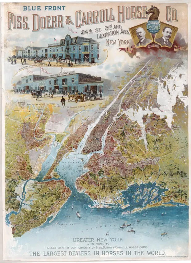 马匹公司Fiss、Doerr和Carroll的宣传地图。由康奈尔大学提供—PJ Mode说服性制图收藏该公司自称是“世界上最大的马匹经销商”,占据了曼哈顿的一个完整街区,并在1897年每周平均销售900匹马。地图提供了城市的鸟瞰图——Mode表示这种技术在当时很受欢迎——因此传达了关于公司运营范围的信息。它旨在张贴在纽约的高架车站。“他们是一家大型公司,”Mode说,“这是他们权力的巅峰。十年后,他们开始销售车辆,二十年后,他们就倒闭了。”