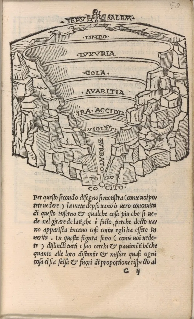 关于地狱的概述,如1506年意大利手稿所示。由康奈尔大学提供——PJ Mode说服性制图收藏埃克塞特大学历史教授、《自由贸易的“阴谋”》*,*马克-威廉·帕伦最近发现了这个收藏。“我在里面迷失了好几天,”他说。帕伦专注于英国和美国的帝国主义,特别对1888年的一张地图感兴趣,该地图描绘了当年总统候选人的贸易政策平台,民主党现任总统格罗弗·克利夫兰和共和党人本杰明·哈里森。虽然克利夫兰及其党派支持自由贸易,但共和党的平台则深具保护主义色彩。