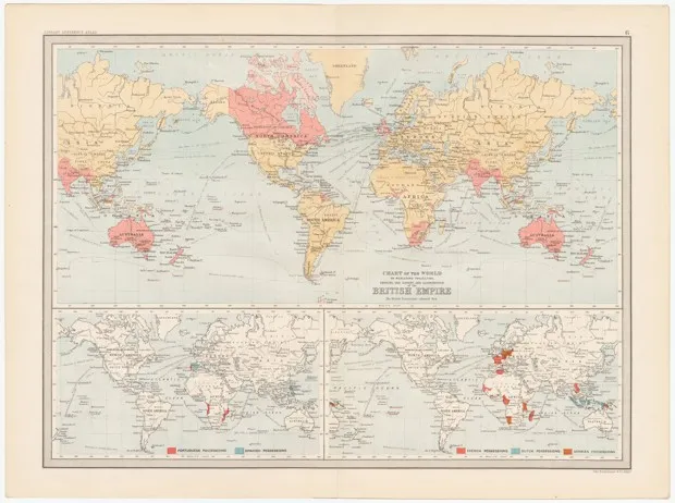 其他地图可能在仔细审视后才会显得具有说服力。Mode 指向一张来自1890年的英国帝国地图。快速查看显示没有什么特别之处:英国的殖民地被涂成粉红色。但仔细观察后,观众可能会注意到这张地图显示了490度的经度,而不是360度——这使得它能够将印度、澳大利亚、新西兰和其他殖民地显示两次,使得帝国看起来比实际更大。
