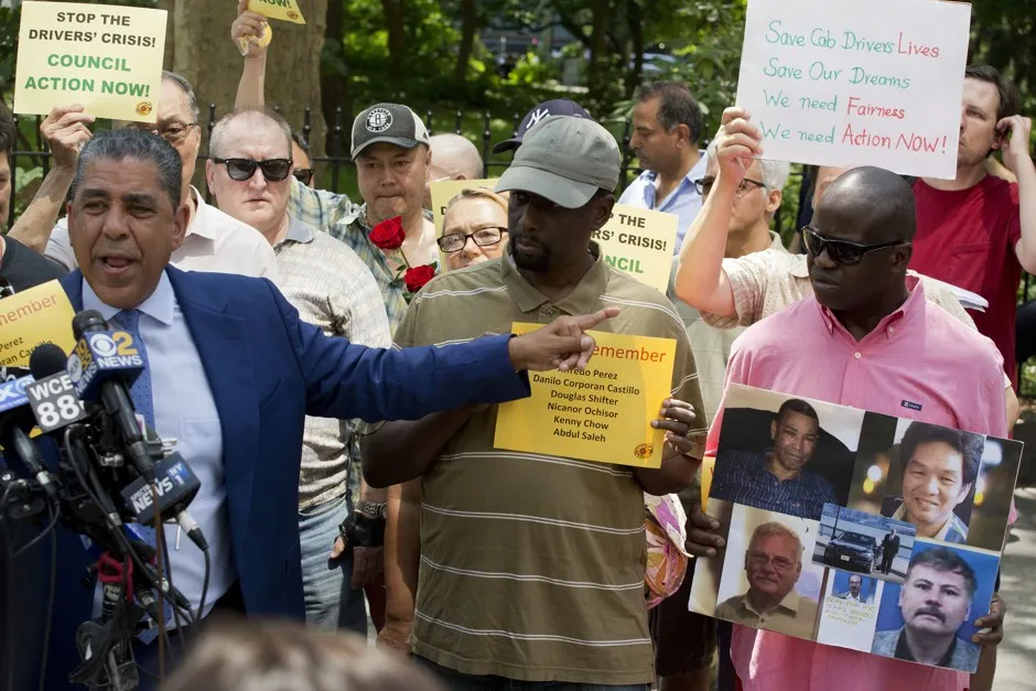 纽约州众议员Adriano Espaillat(左)在2018年6月18日纽约出租车工人联盟在市政厅举行抗议时发言。一名抗议者手持一张自杀出租车司机的照片。马克·伦尼汉/AP### 运输中的死亡:债务和绝望推动出租车行业的自杀危机