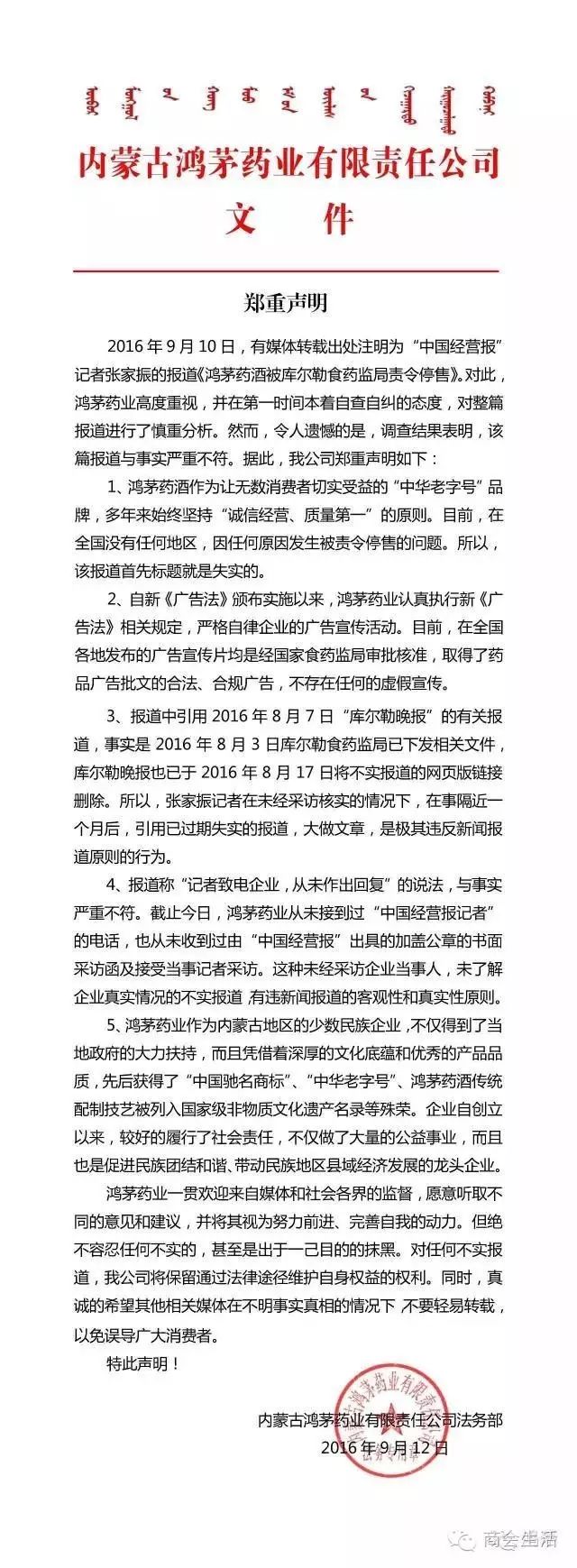 2016年09月12日,内蒙古鸿茅药业有限公司发表《鸿茅药业的郑重声明》稿,指称“针对‘中国经营报’记者不实报道,鸿茅药业将法律维权”。