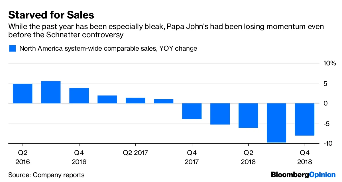 早在2017年,Schnatter 就把跪着的足球运动员归咎于他公司比萨销量的下滑,因为闭嘴,这就是原因。公司不得不 匆忙 清理那个烂摊子,结果 Schnatter 又在一次电话会议中 使用 了“n”字,没错,就是为了谈论公关策略。Papa John’s 也试图清理那个烂摊子,包括与 Schnatter 保持距离。但 Sarah Halzack 指出它的销售问题去年变成了一场大败: