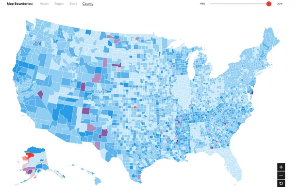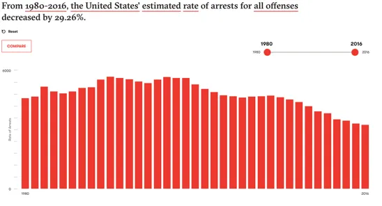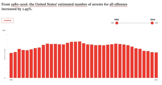 维拉的工具让用户可以调整互动图表的杠杆,以显示1980年至2016年间按犯罪类型划分的全国年度逮捕数据。(数据说明: “报告的”逮捕数据来自一个汇集执法机构自愿报告的FBI数据库,可能存在缺失数据。为了避免低估问题,FBI还发布了该数据的估算值,可以通过选择“估算”选项查看。)