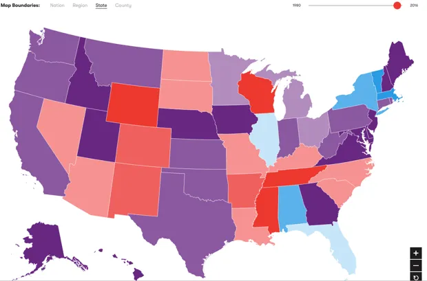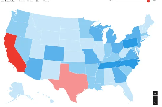 Vera的工具还按地理区域细分这些趋势——让用户可以按地区、州和县探索逮捕的比率和数量。在2014年(最后一年有数据可用)估计的逮捕数量中,加利福尼亚州和德克萨斯州的人口最多,位居榜首。