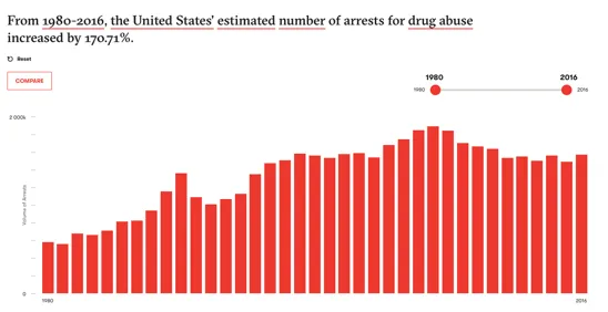 维拉司法研究所暴力犯罪在这些逮捕中只占很小的比例——在2016年,仅约5%。因此,尽管三十年的 毒品战争 可能随着更多州和城市对大麻使用的非刑事化而逐渐消退,但其制度化的低级别毒品执法方式仍然存在。在此期间,毒品逮捕(如下图所示)——绝大多数是与大麻相关的犯罪——增加了约171%。纽斯特特说:“因此,更多的人最终卷入刑事司法系统并被逮捕,而不是更多的预防性问题解决机制。”