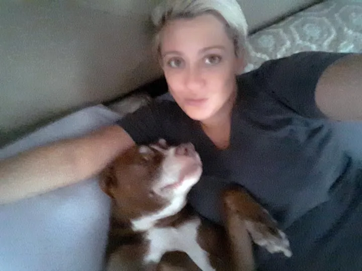 Whitten与她的一只狗的自拍。来源:Laura Whitten提供Benton错过了十多年感恩节晚餐、生日和圣诞节,但对Whitten来说,悲伤在意外的、偶然的时刻最为尖锐。就像Benton五岁的侄子刚洗完澡,穿着达斯·维达的浴袍走进客厅,依偎在她的狗身边,而狗也穿着一件配套的星球大战睡袍。