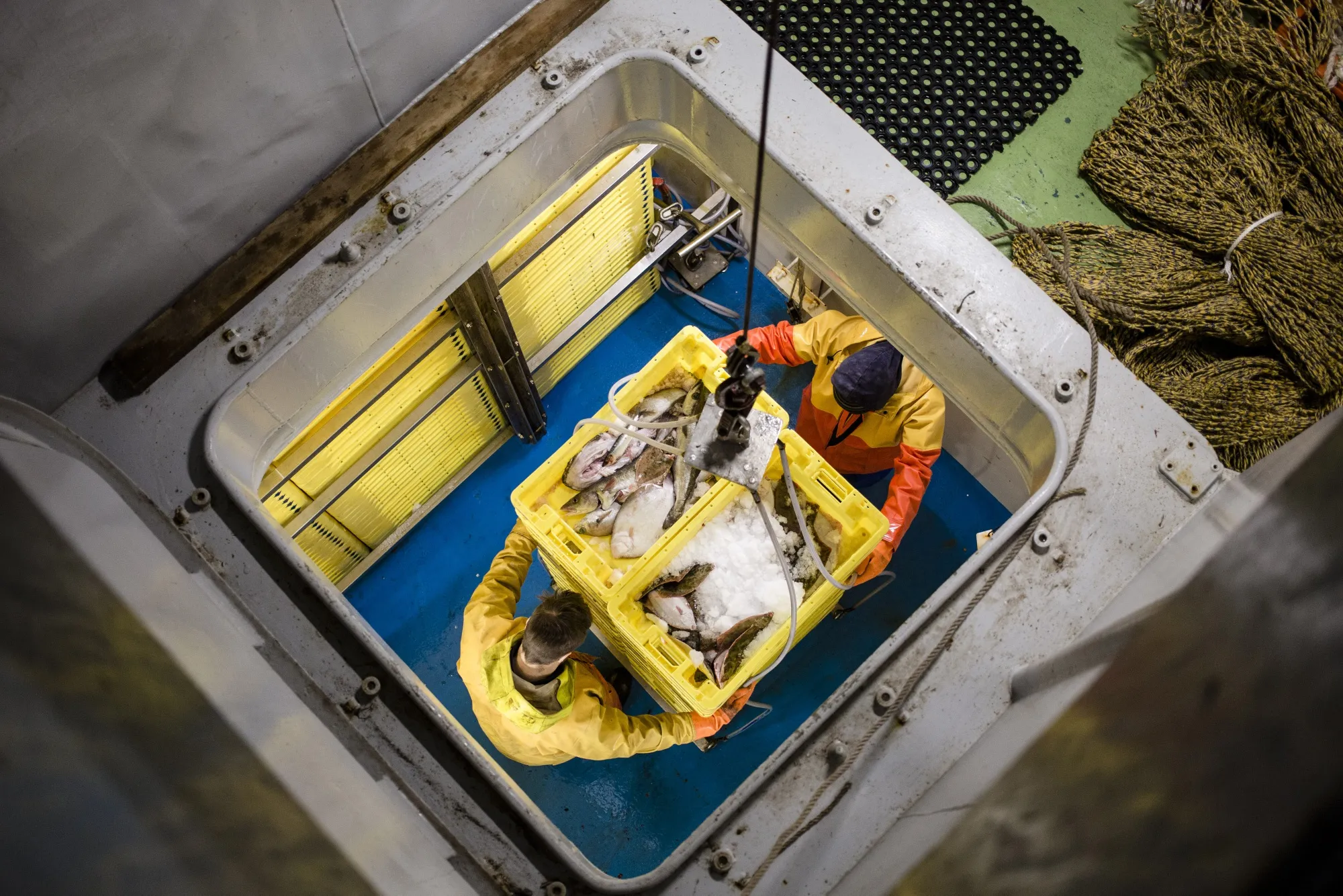 渔民使用绞盘将鱼箱从拖网渔船的货舱中运输出来。