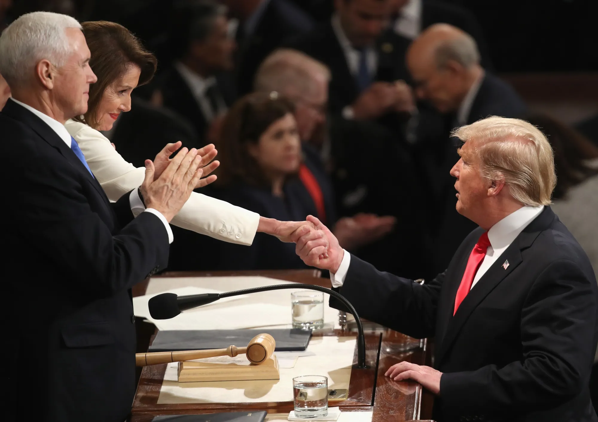 华盛顿特区 - 2月5日:总统唐纳德·特朗普与众议院议长南希·佩洛西握手,副总统迈克·彭斯在旁观看,之后在美国国会大厦的众议院会议厅发表国情咨文。特朗普总统的第二次国情咨文因部分政府停摆推迟了一周。(照片由温·麦克纳米/Getty Images提供)摄影师:温·麦克纳米/Getty Images北美### 特朗普最新的移民提议对民主党来说太好了,无法放弃 – 卡尔·W·史密斯