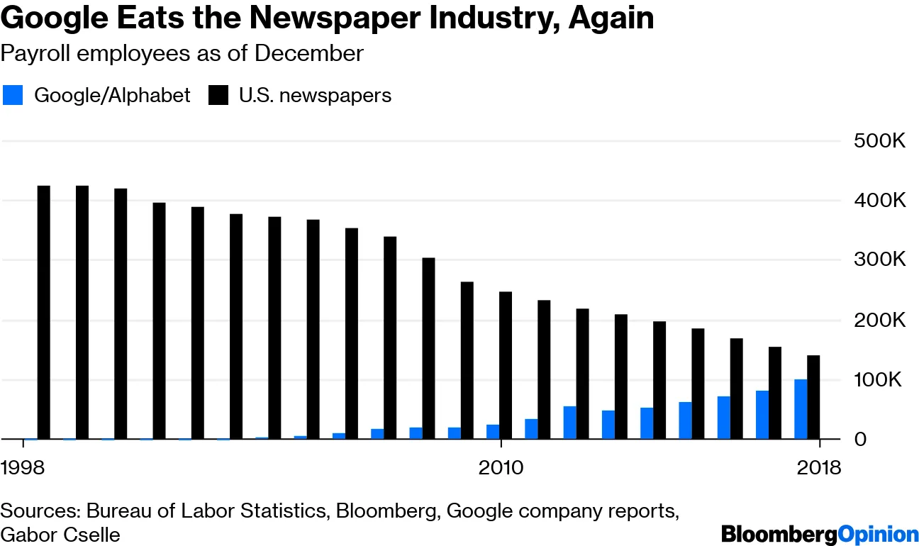 很快,谷歌将 雇佣的人数超过整个美国报纸行业,如果它还没有的话。这对民主来说不是一个好兆头,贾斯廷·福克斯警告道。