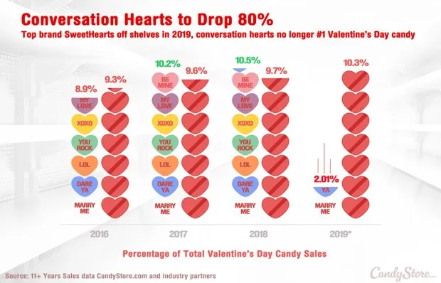 与此同时,糖果心形信息变得更短、更甜腻,且更受欢迎。“做我的”与“初吻”超越了“劳驾,先生。”后来,标签和“<3”也进入了这个场景。到2011年,Necco表示它每年生产1000万到1400万磅的对话糖果。在2017年和2018年,CandyStore.com 将这些糖果评为全国最畅销的情人节糖果。