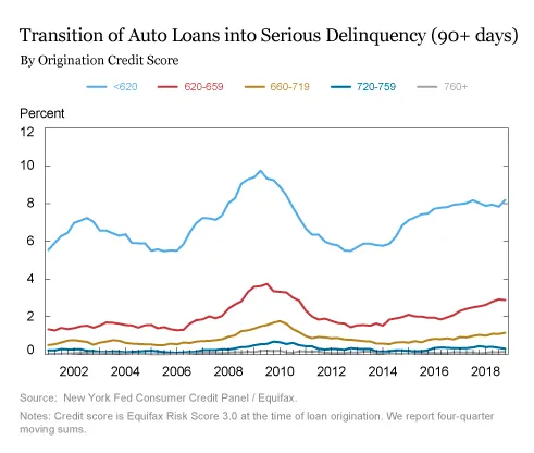 但越来越多的借款人违约其汽车贷款,专家表示这是家庭面临严重财务压力的信号:因为汽车是如此重要,美国人通常优先偿还这些贷款而不是其他贷款。对冲基金经理史蒂夫·艾斯曼因在经济衰退前发现设计不良的抵押贷款而在书籍和电影大空头中成名,在2017年对金融时报表示,汽车贷款在那些年里通常表现得比抵押贷款好,因为消费者“往往首先违约房屋贷款,其次是信用卡,最后是汽车贷款。”
