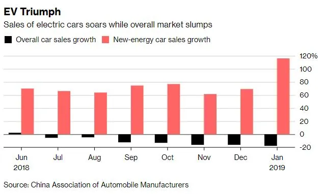 电动汽车是全球最大汽车市场中唯一的亮点。中国的新能乘用车交付量,包括纯电池、插电式混合动力和燃料电池汽车,在一月份超过了85,000辆,增长了两倍多,在政府缩减补贴之前的抢购推动下。相比之下,乘用车的总销售量暴跌近18%,降至202万辆,依据本周中国汽车工业协会的数据。
