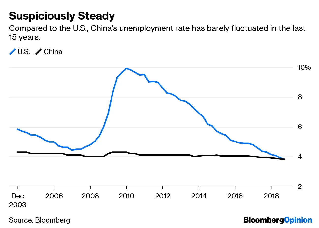 中国的就业数据 甚至比国家的GDP数据更不可靠,而这些不准确 可能会带来危险的后果,克里斯托弗·巴尔丁为《彭博社观点》撰写道。去年年底官方失业率为3.8%,这一数据值得怀疑,因为出口商在贸易紧张局势中已经减少了招聘,而去杠杆化运动也影响了私营部门。