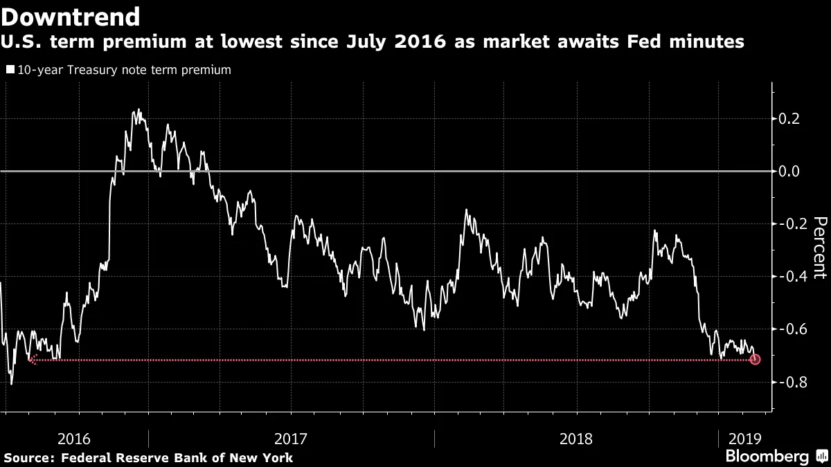 这是目前市场上最大的坏消息其实是好消息的事情。投资者要求持有长期美国政府债务相对于短期证券的额外补偿,即所谓的期限溢价,正在降至历史低点。感谢美联储和欧洲央行的温和鸽派声明,以及全球量化紧缩威胁的减退。这正在提升全球流动性状况和对收益的争夺,同时减少国债市场作为资本竞争者的威胁,损害风险资产。而且这不仅仅是发达市场的故事。根据德意志银行的说法,新兴市场的通胀调整利率下降的一个主要驱动因素是当地期限溢价的正常化,从而提升固定收益回报。好消息是,这表明全球货币政策的预期是稳定的,推动跨资产波动性降至看涨低点。但这发生的原因并不好。债券投资者在押注全球经济正在同步放缓。而这一前景提供了如此有限的更高价格压力的能力,以至于几乎不可能促使利率制度的重大转变,尤其是考虑到技术和老龄化人口等结构性力量。另一种思考方式是,我们实际上正在更接近于牛市的低实际利率、低经济波动性时代——但风险偏好更有限,企业现金流增长的机会更少。